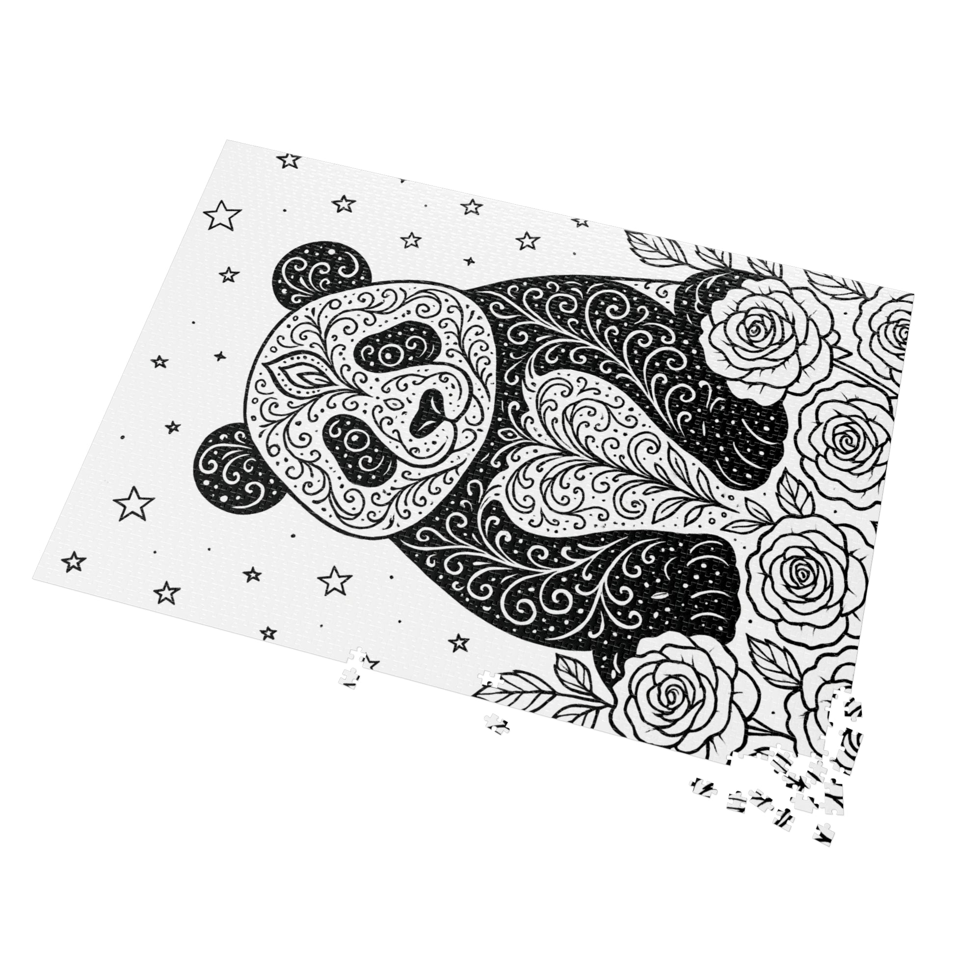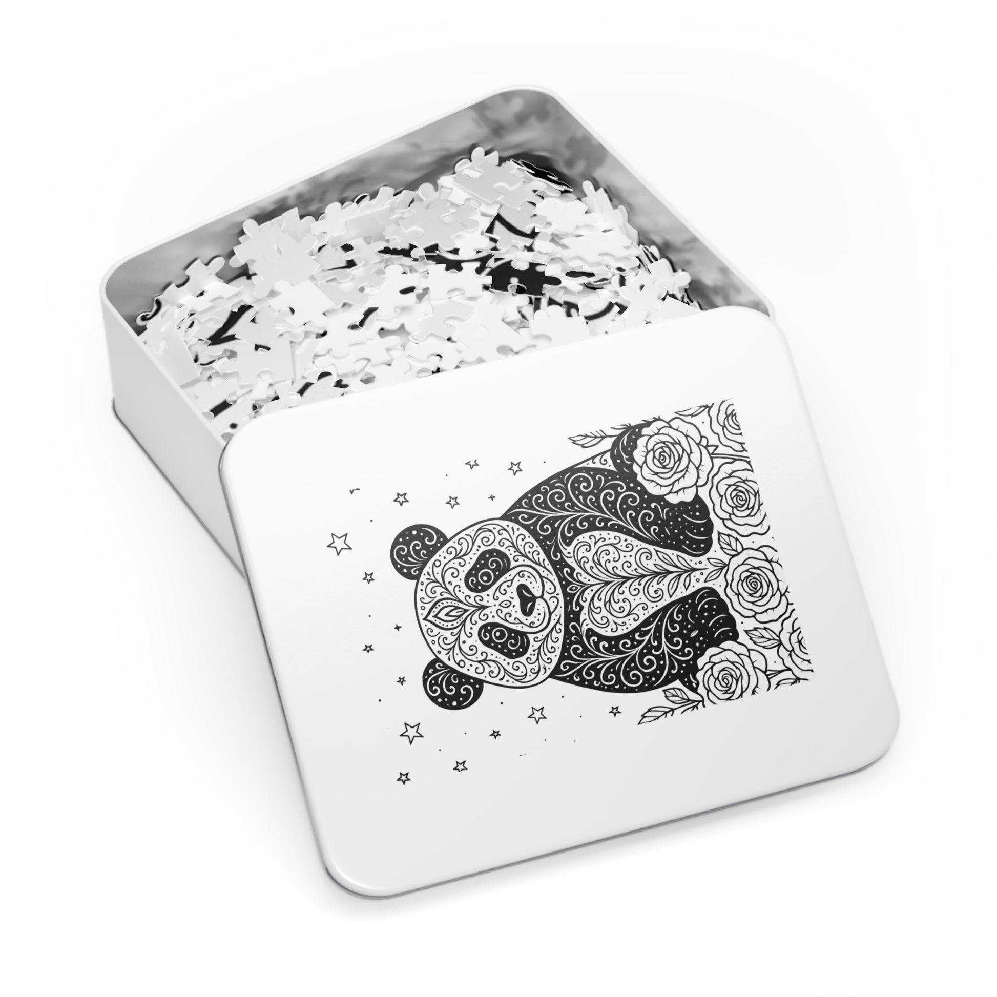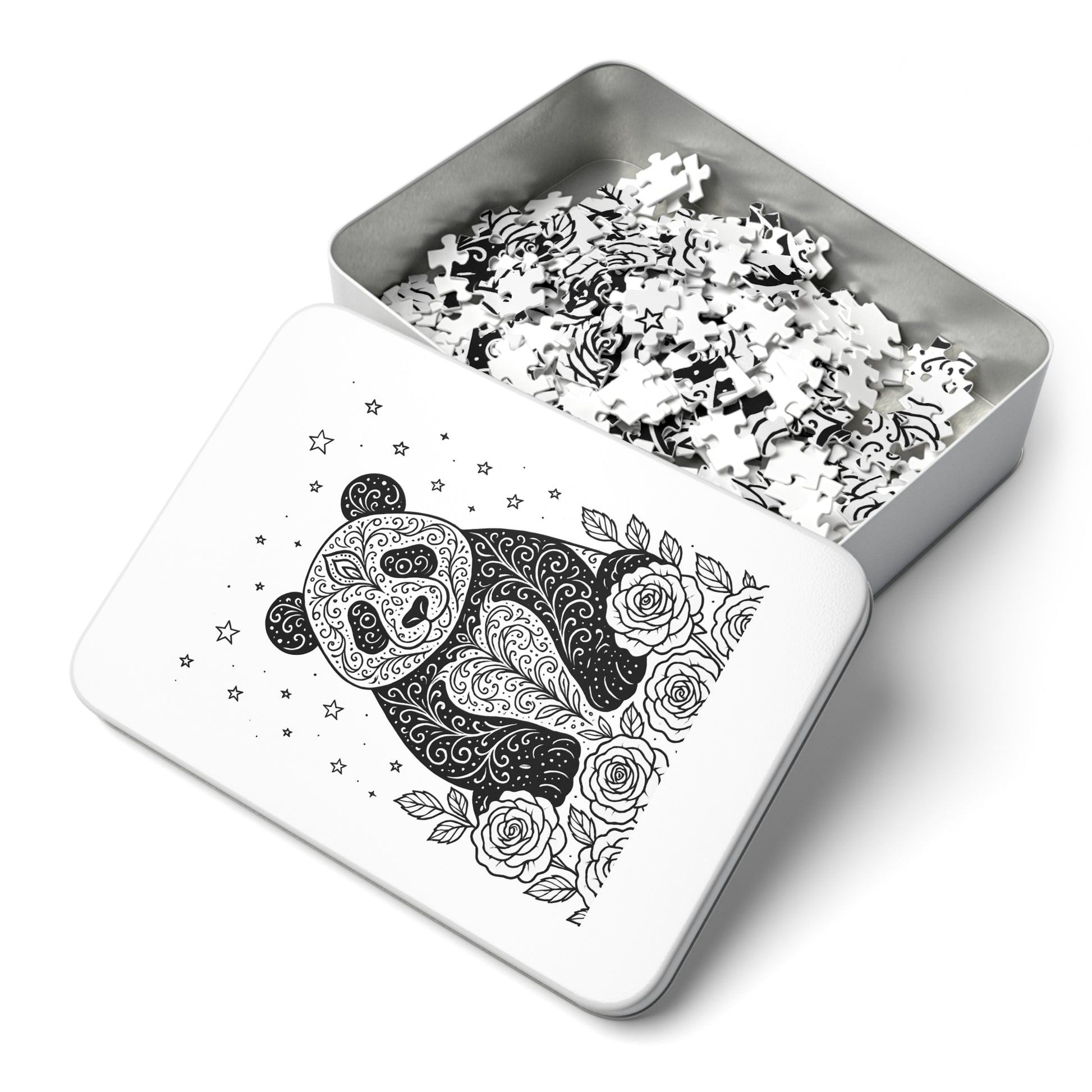 Color the puzzle or keep black and white. Lose yourself in a quiet, creative ritual: this tin-packed jigsaw invites slow focus and a splash of whimsy. The intricate black-and-white panda illustration reads like a coloring-page for grown-ups — detailed vines, curling petals and patterned fur that pull you into tiny, satisfying fits of connection as each piece locks into place. The glossy, high-contrast print keeps lines sharp and makes the finished image pop on the tin lid, so the puzzle is as attractive stored away as it is spread across the table. Choose from multiple piece counts to match your mood — a quick 30-piece warm-up, a cozy 500-piece evening project, or a patient 1000/2000-piece challenge — and keep everything together in the sturdy white metal tin that carries the finished image on its cover. This puzzle feels like a slow afternoon with a hot drink and your favorite playlist, or a calm group activity where conversation drifts between pieces.
