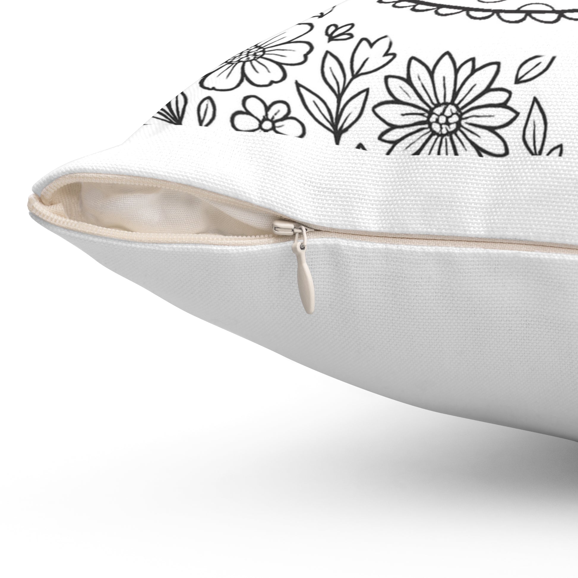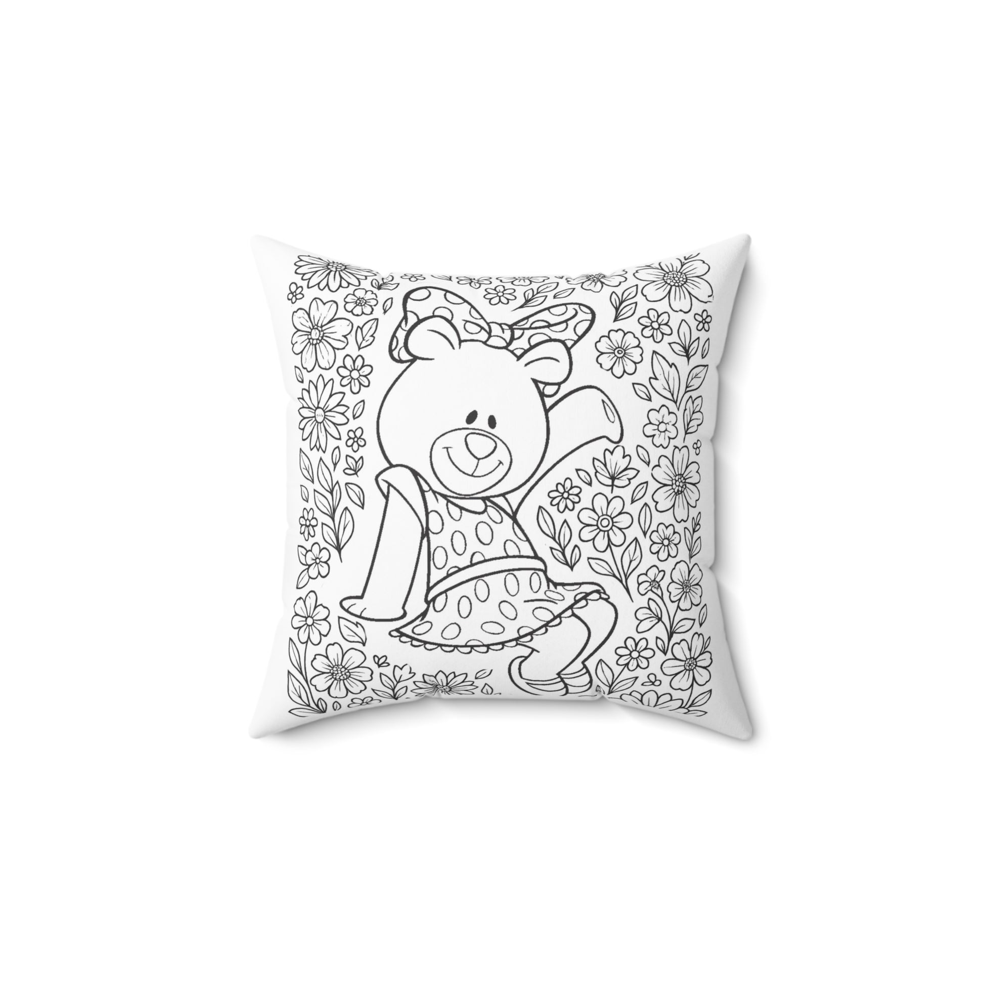 Color this with permanent markers or leave as is! Bring a touch of cozy creativity to a your room with this soft, double-sided throw pillow featuring a cheerful bear doodle framed by a field of flowers. Light and breathable spun polyester keeps the cover smooth and wrinkle-free, while the slightly oversized recycled-poly insert fluffs into a plump, huggable shape when assembled. It looks at home on a reading nook, nursery rocker, or tucked into a playroom fort, adding warmth and a handmade feel without fuss. The concealed zipper keeps the edges clean, and the neutral tones pair easily with pastel dorm rooms, apartments and sorority rooms.