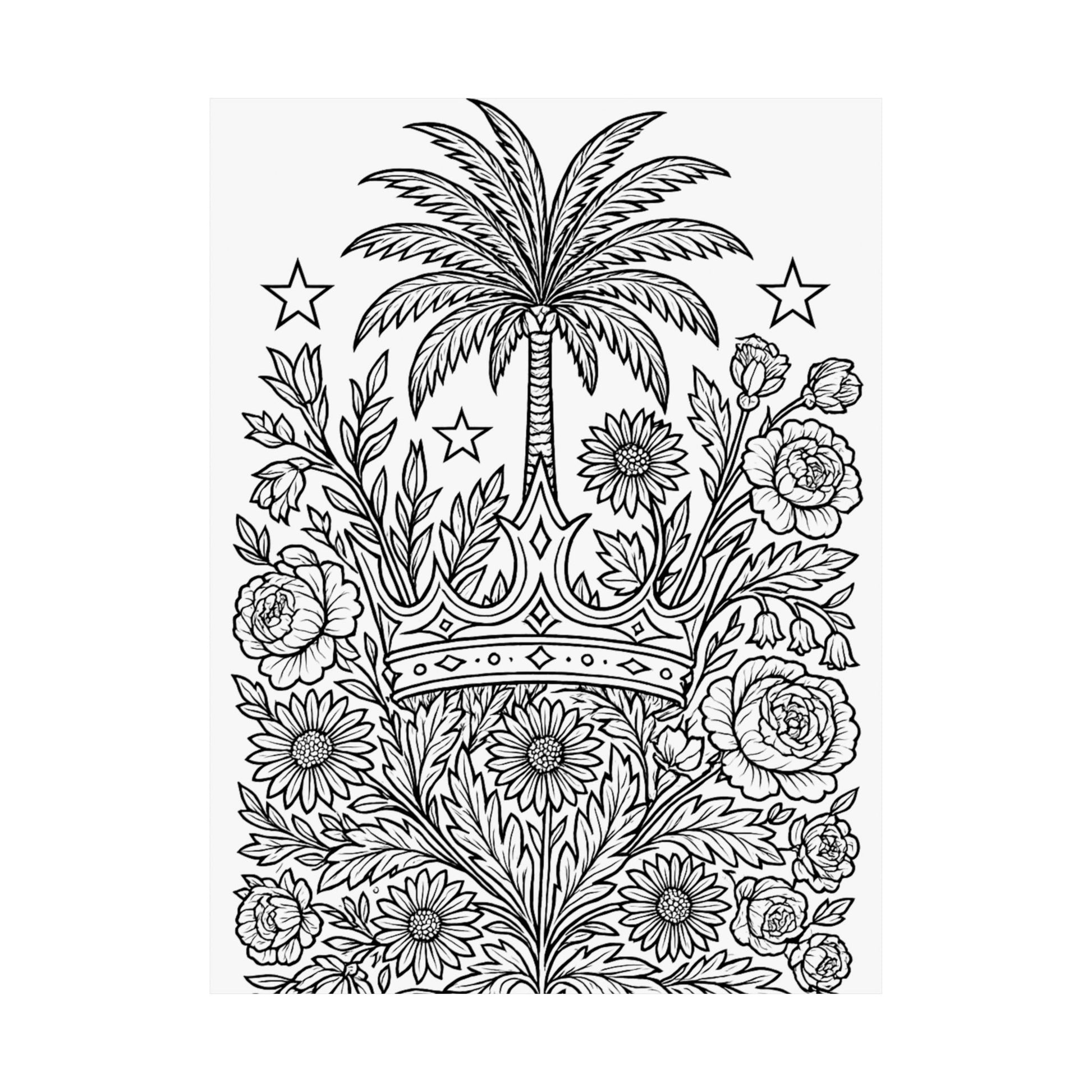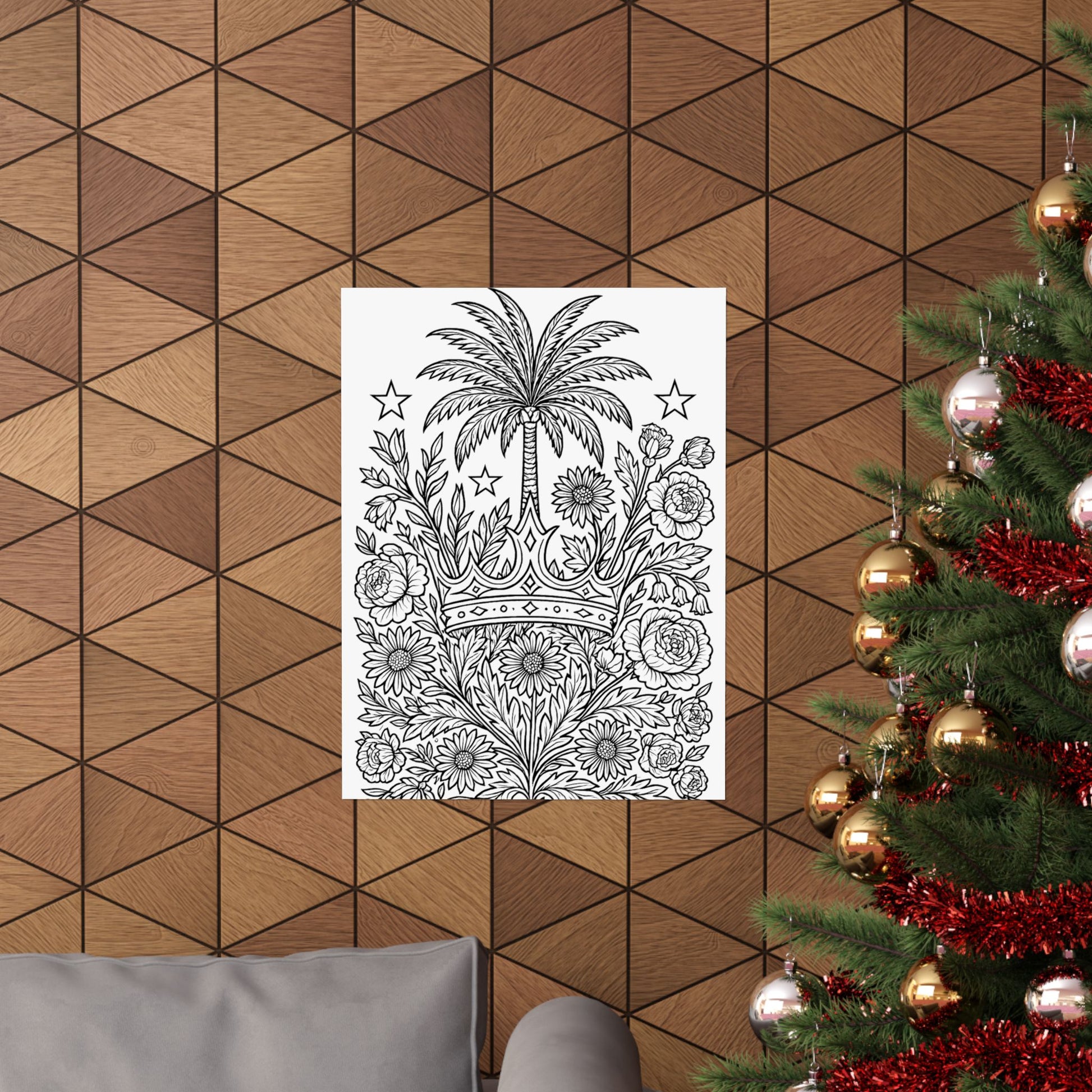 A Crown and Palm Tree poster that can be colored or left black and white, perfect for art enthusiasts and those looking to add a unique touch to their home decor. Ideal for individuals who enjoy creative activities and want to personalize their living space. Relevant for occasions such as birthdays, housewarmings, and art-themed parties.