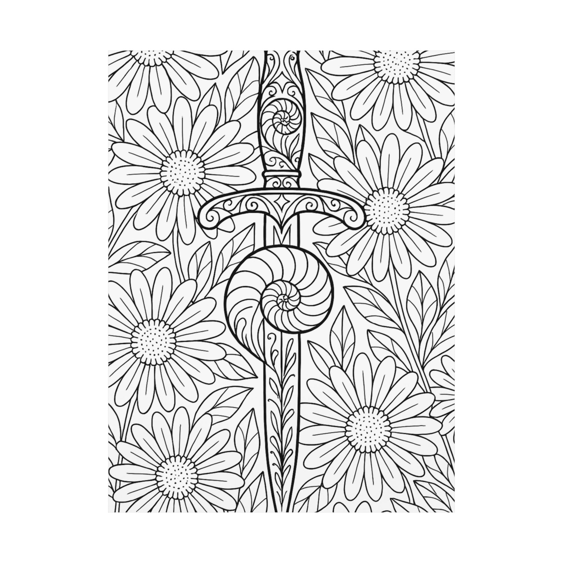 An ornate dagger and nautilus shell poster that can be colored or left black and white, perfect for art enthusiasts and those looking to add a unique touch to their home decor. Ideal for individuals who enjoy creative activities and want to personalize their living space. Relevant for occasions such as birthdays, housewarmings, and art-themed parties.