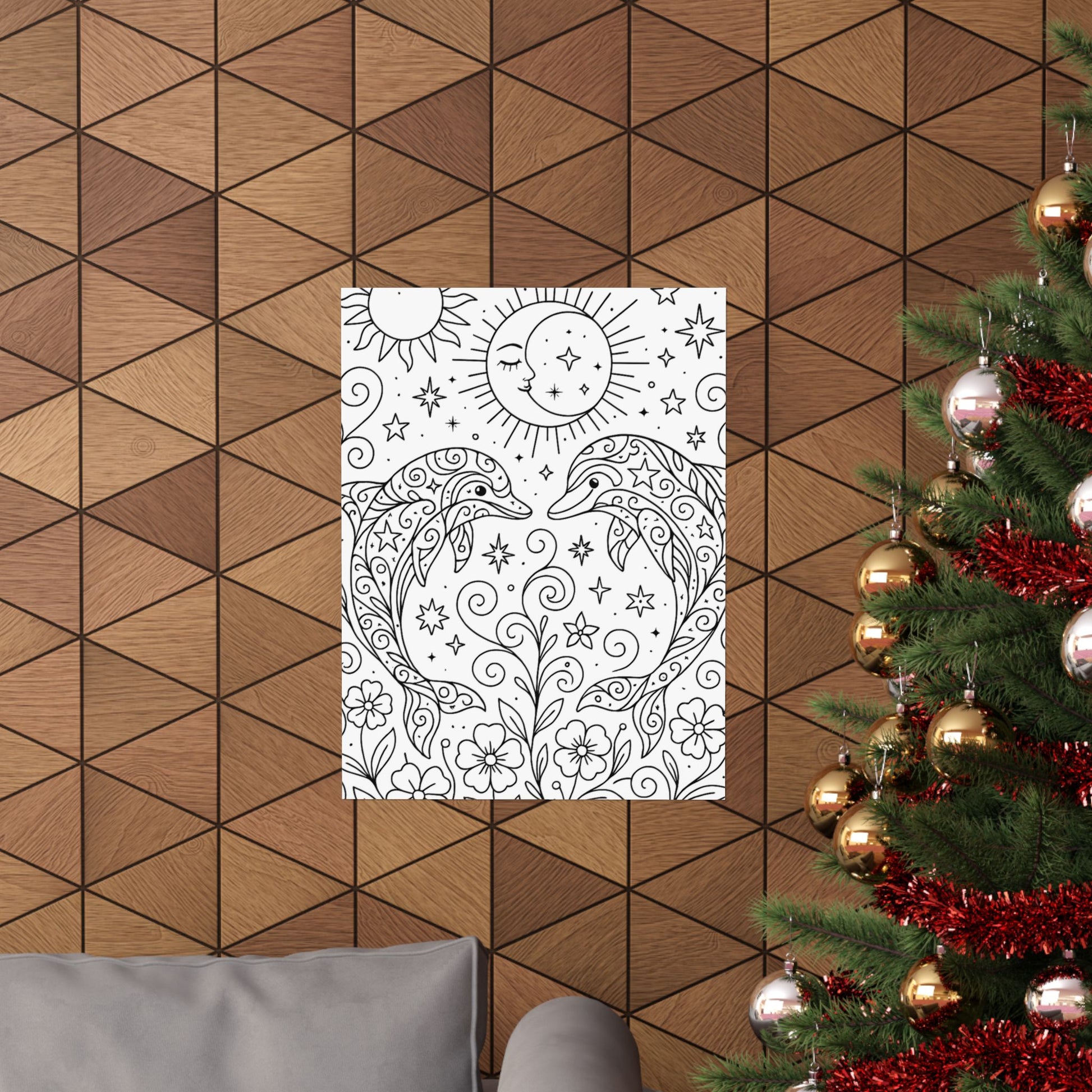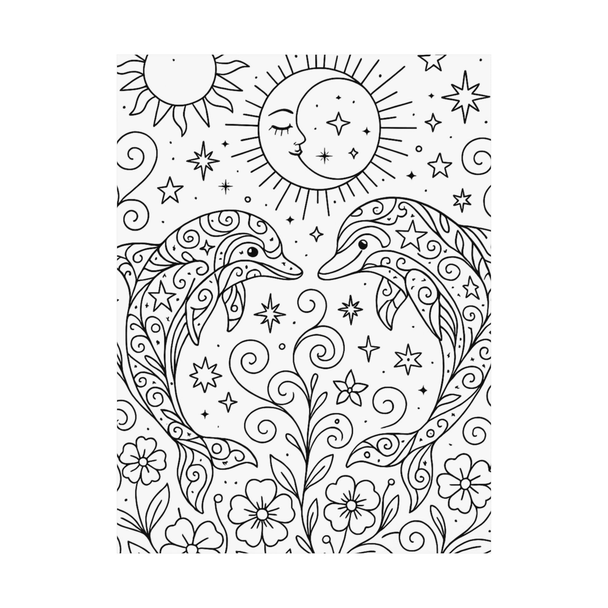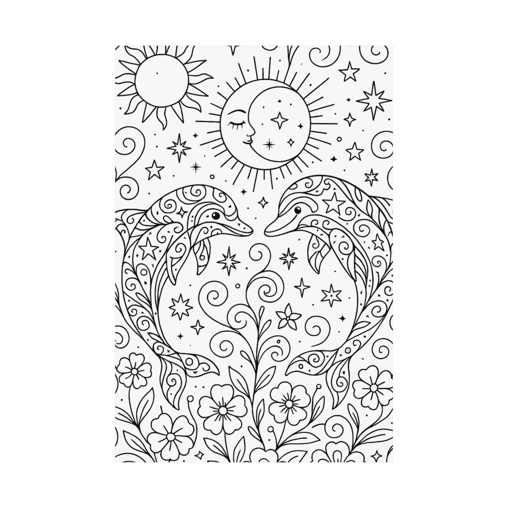 This poster features two dolphins that can be left black and white or personalized with your own color choices. It gives a calming and peaceful vibe, perfect for adding a touch of nature to any room. Ideal for dolphin lovers and those looking to customize their decor. Relevant for beach-themed decor, nature lovers, and marine life enthusiasts.