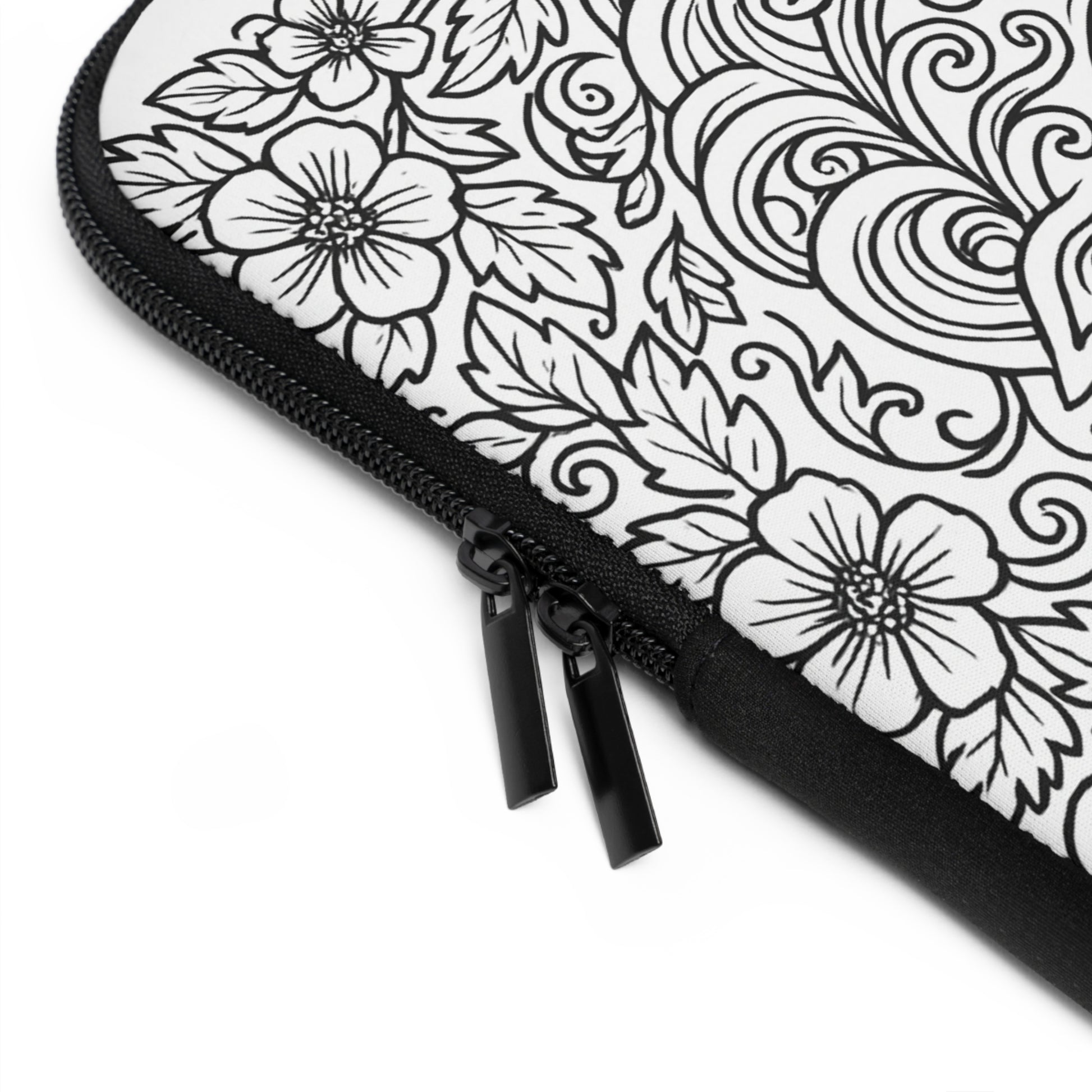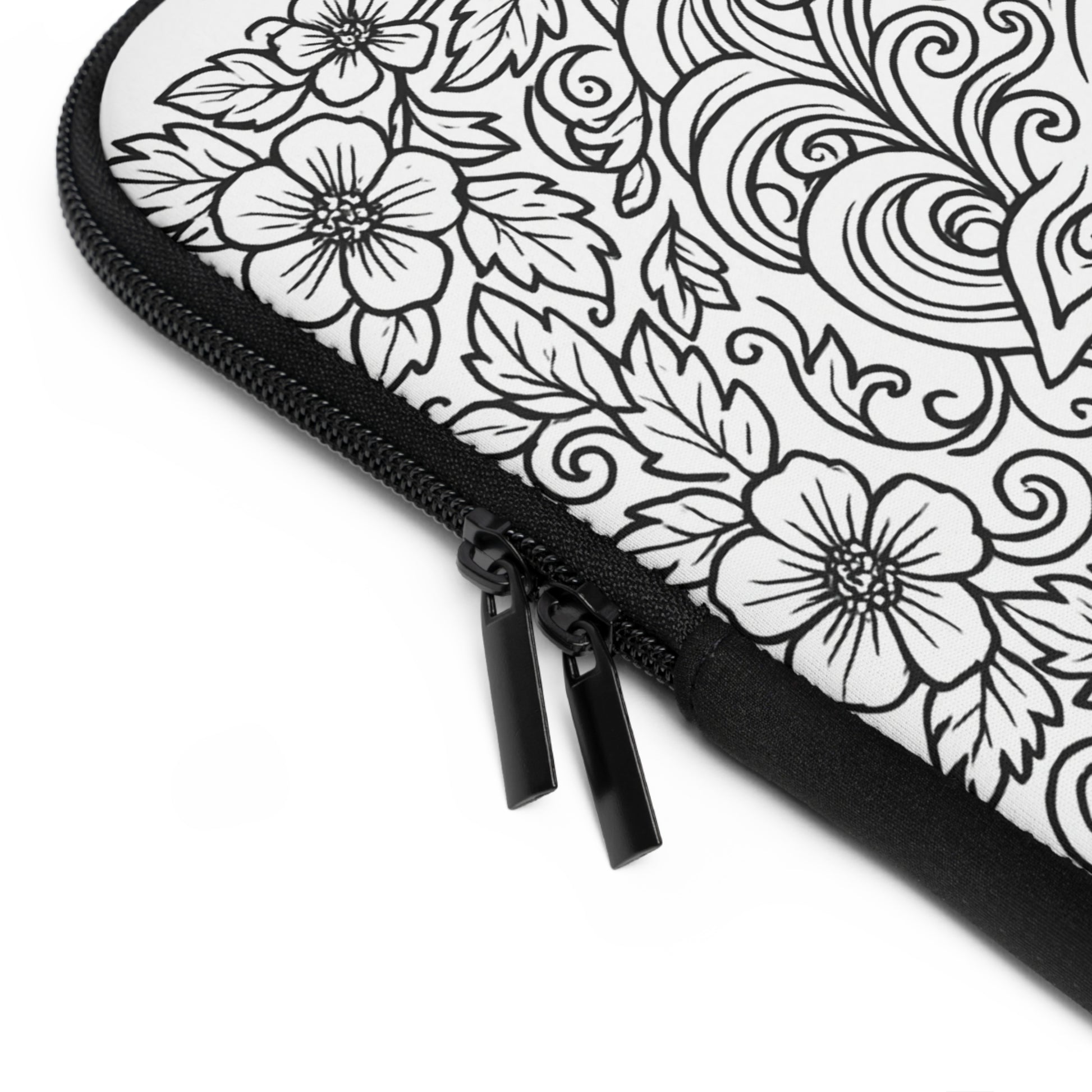 A slim neoprene laptop sleeve that brings calm and personality to daily carry. The front features a hand-drawn, black-and-white floral-and-dove illustration with a small heart monogram area, while the back remains solid black for a clean, low-profile look. Soft foam padding cushions your device against everyday bumps. Dual zippers glide smoothly for quick access, and the water-resistant build keeps spills and light rain from reaching your laptop. Lightweight and available in multiple sizes, this sleeve slips easily into backpacks or tote bags and adds a gentle, artistic touch to study sessions, campus walks, or coffee shop workdays.