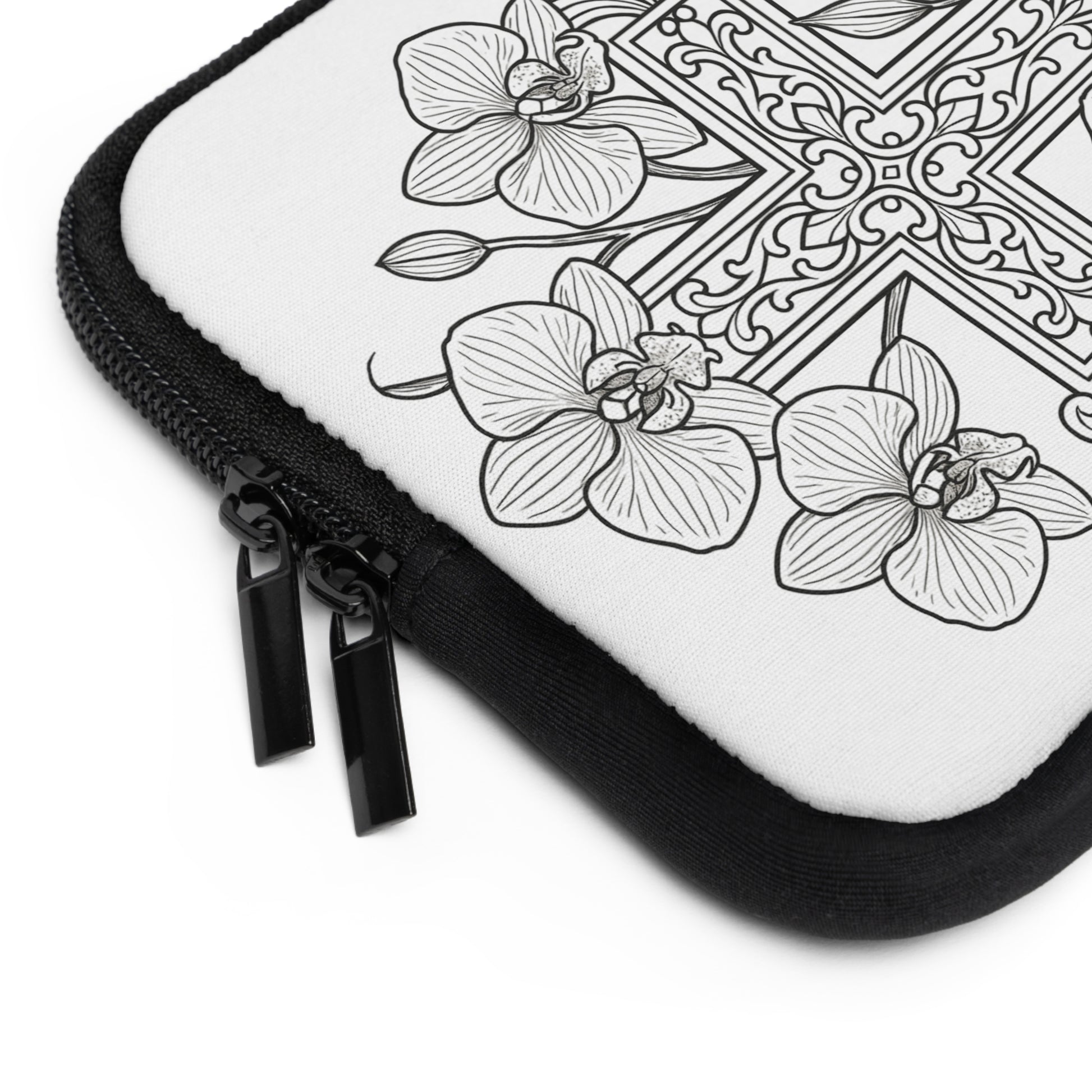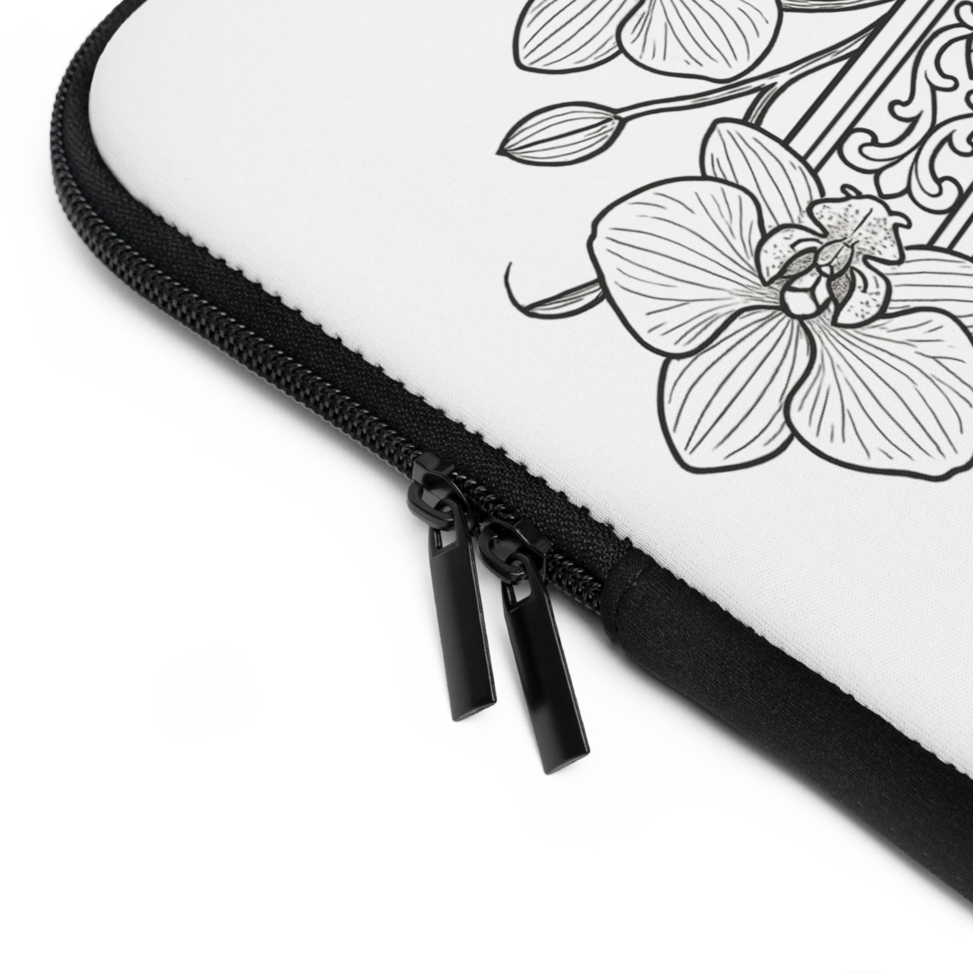 A slim neoprene laptop sleeve that brings calm and personality to daily carry. The front features a hand-drawn, black-and-white floral-and-dove illustration with a small heart monogram area, while the back remains solid black for a clean, low-profile look. Soft foam padding cushions your device against everyday bumps. Dual zippers glide smoothly for quick access, and the water-resistant build keeps spills and light rain from reaching your laptop. Lightweight and available in multiple sizes, this sleeve slips easily into backpacks or tote bags and adds a gentle, artistic touch to study sessions, campus walks, or coffee shop workdays.