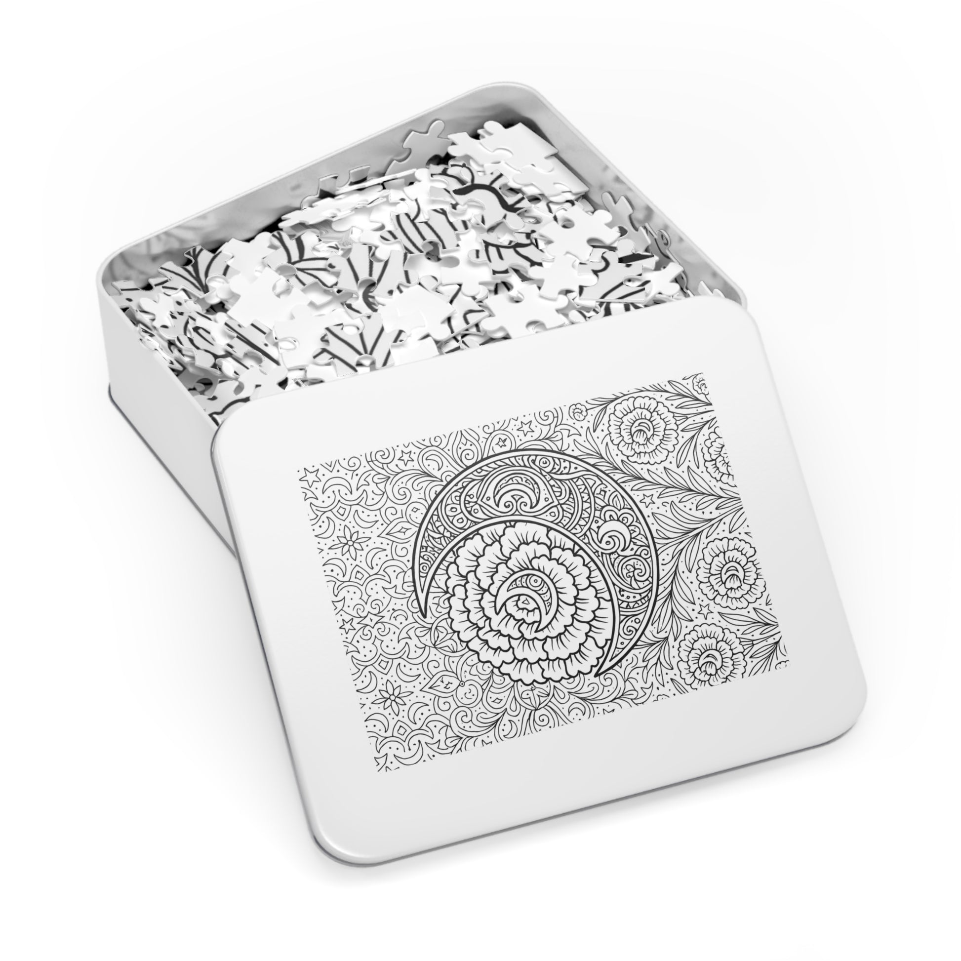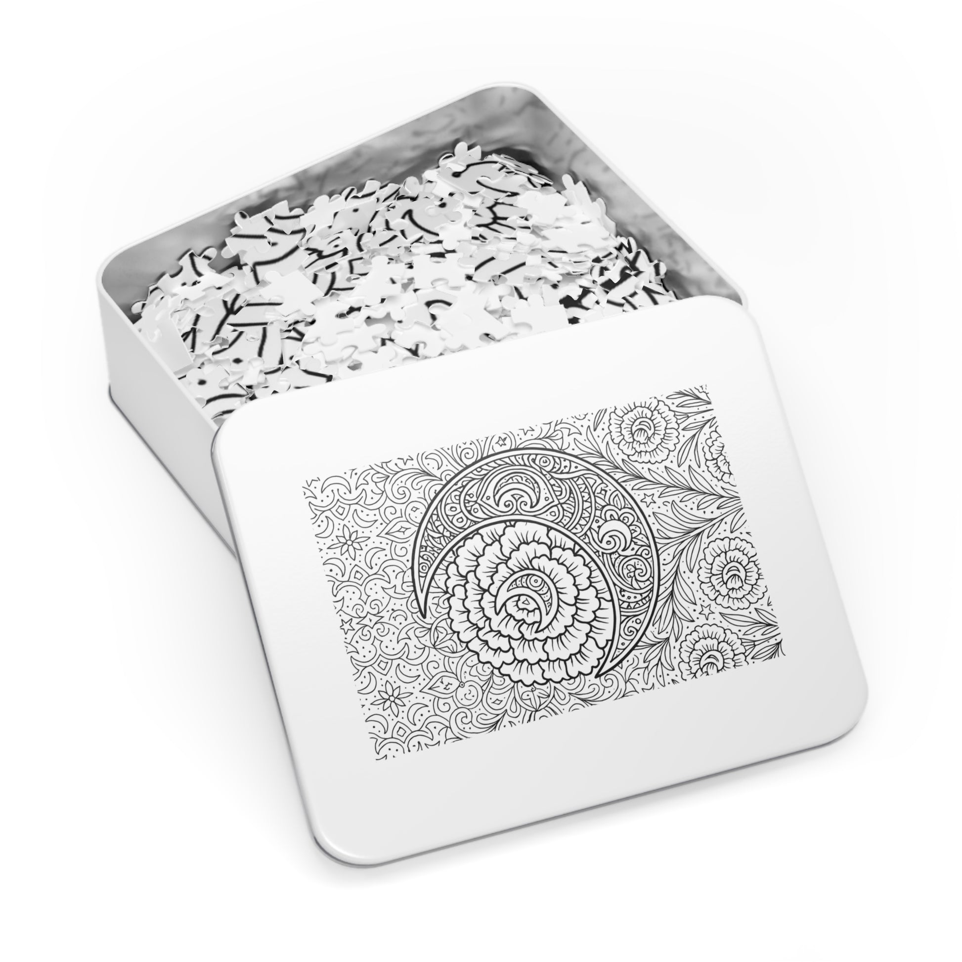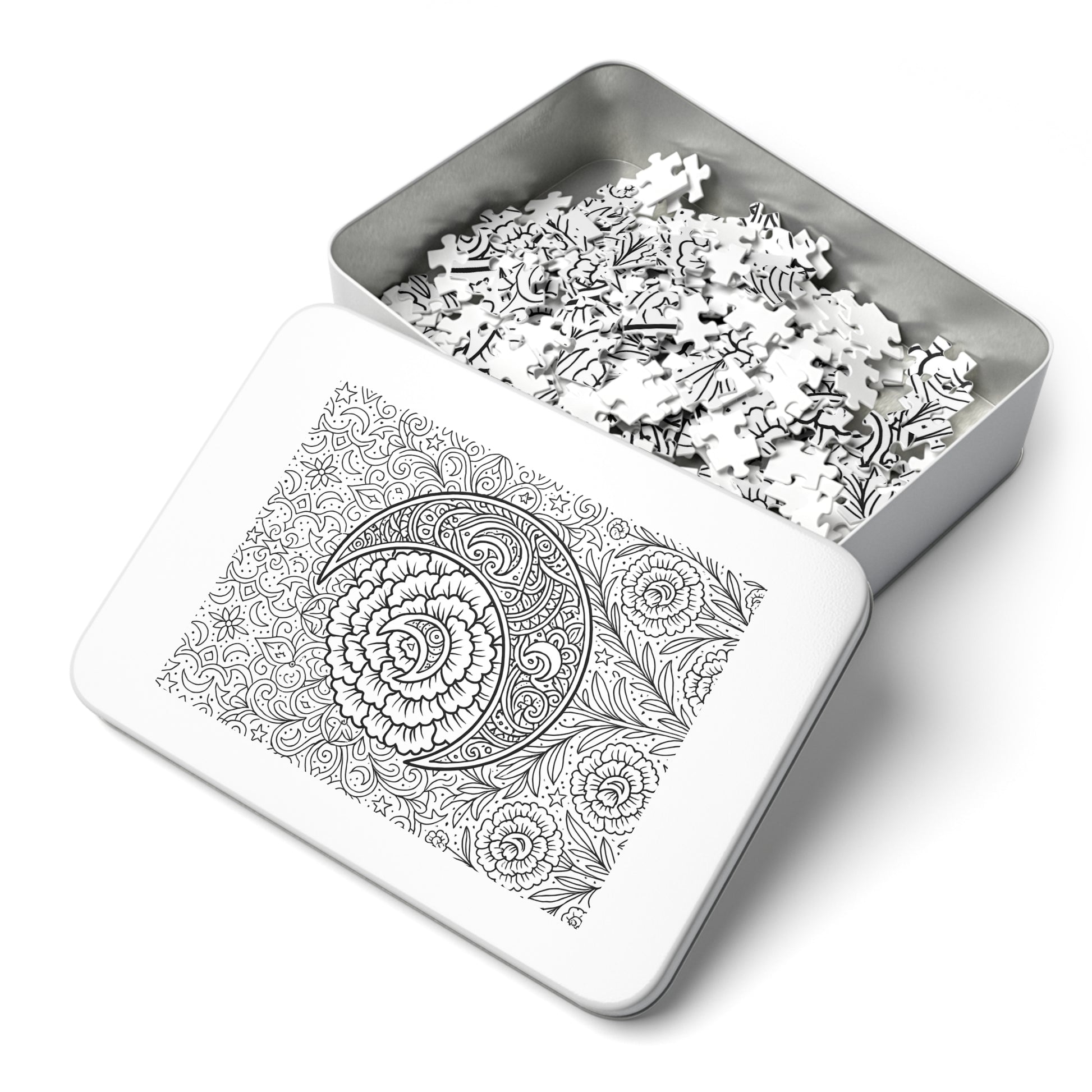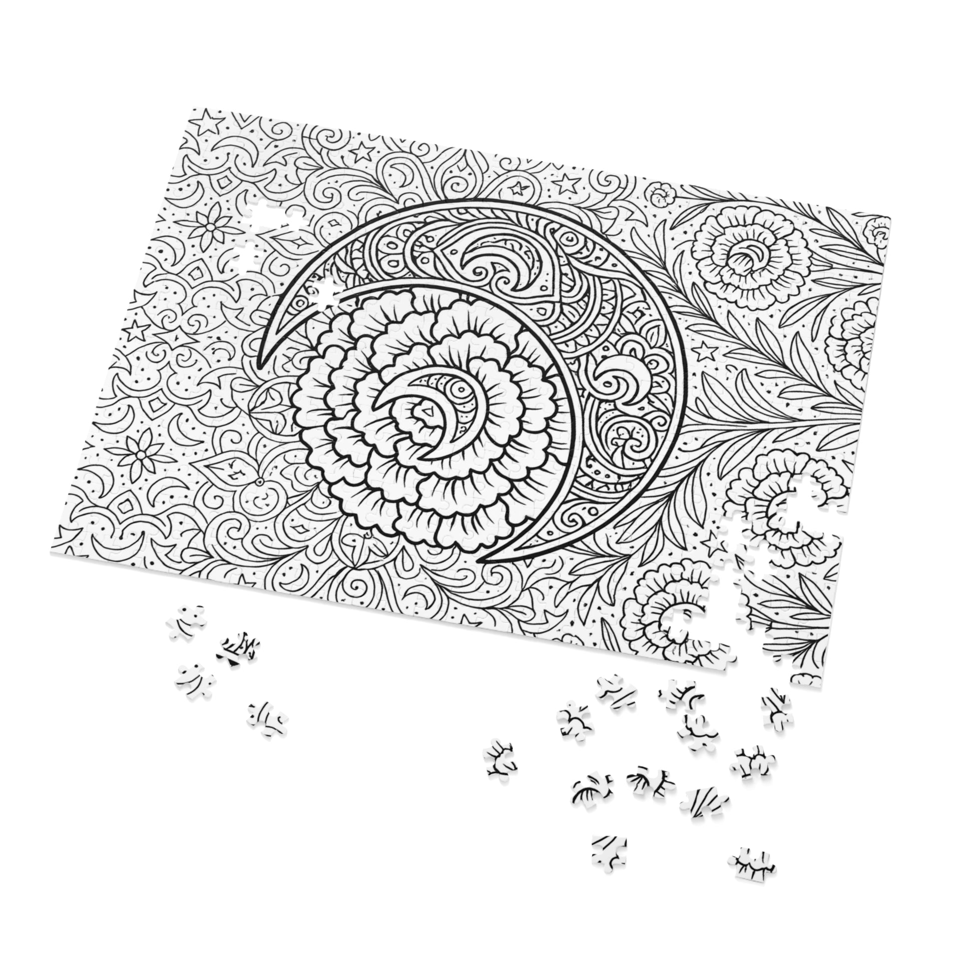 A beautiful crescent moon and carnations puzzle that can be colored or left black and white, providing a calming and relaxing activity. Perfect for puzzle enthusiasts, artists, and nature lovers. Ideal for gifting on birthdays, holidays, or as a thoughtful self-care treat.