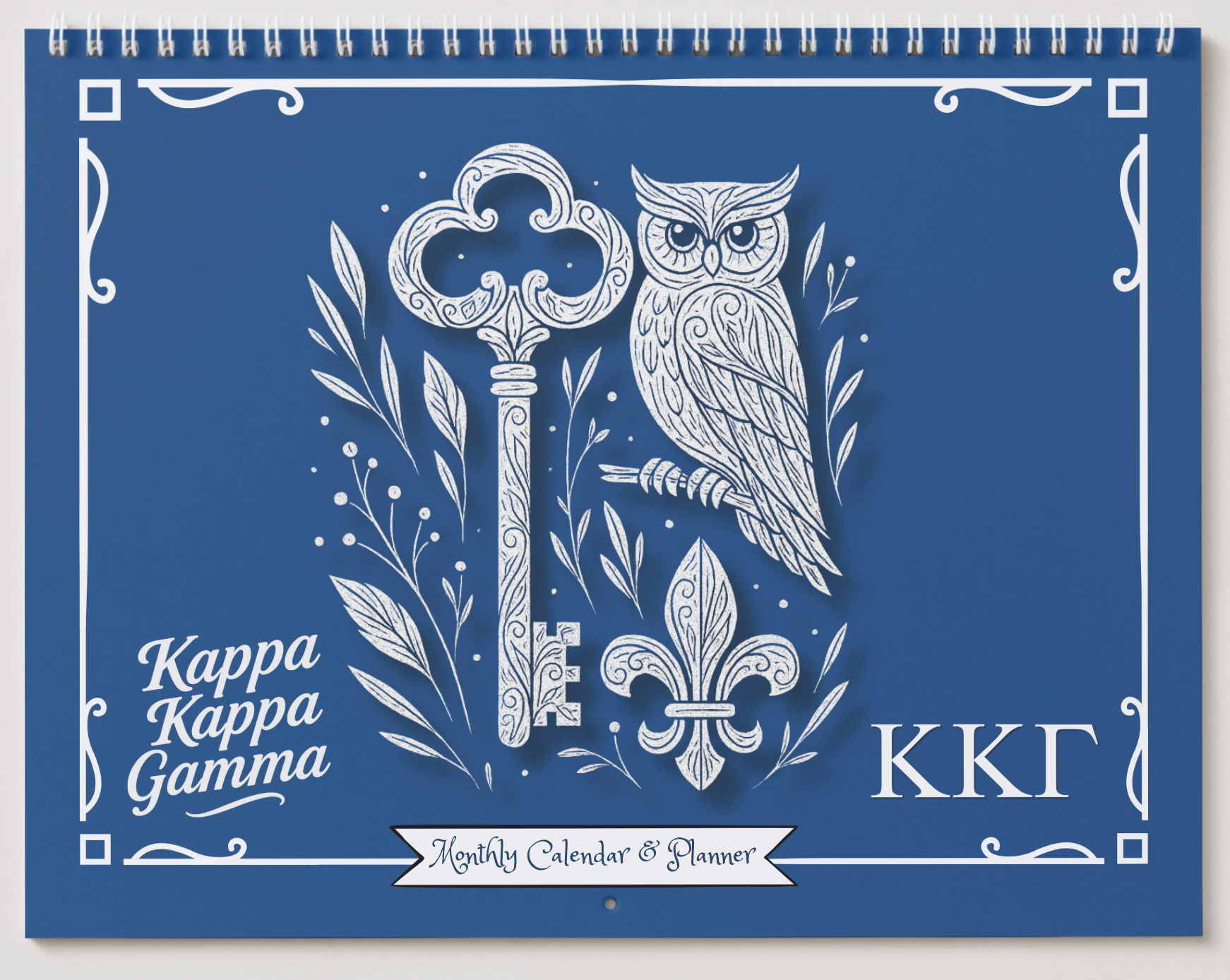 Celebrate your Kappa Kappa Gamma pride with this charming sorority wall calendar featuring beautifully detailed illustrations inspired by the sisterhood’s cherished symbols—the wise owl, the iconic key, and the elegant fleur-de-lis woven throughout the year. Each month brings a fresh blend of tradition and whimsy, pairing timeless elegance with the confident, joyful spirit that Kappa women know and love.