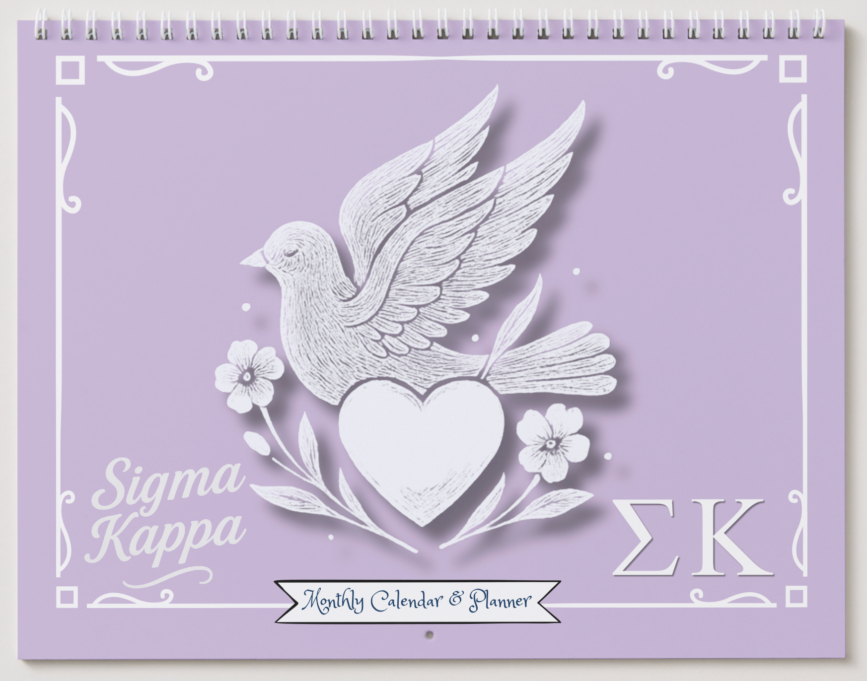 Celebrate your Sigma Kappa pride with this charming sorority wall calendar featuring beautifully detailed illustrations inspired by the sisterhood’s cherished symbols—the graceful dove and the heartfelt heart woven throughout the year. Each month brings a fresh touch of peace, sisterhood, and love, blending timeless elegance with the warm, genuine spirit that Sigma Kappas know and love.