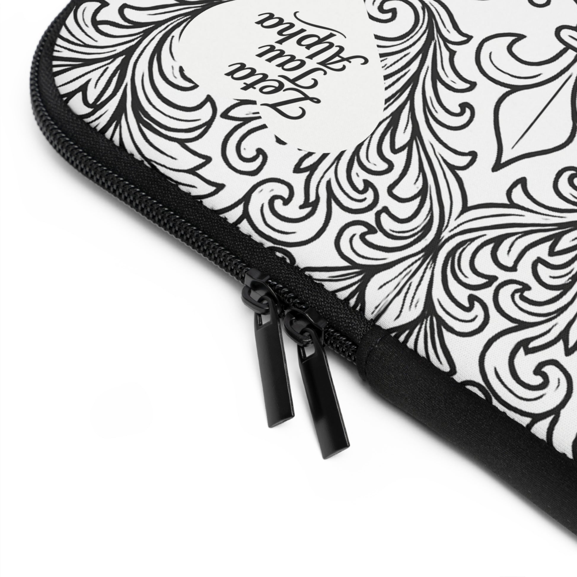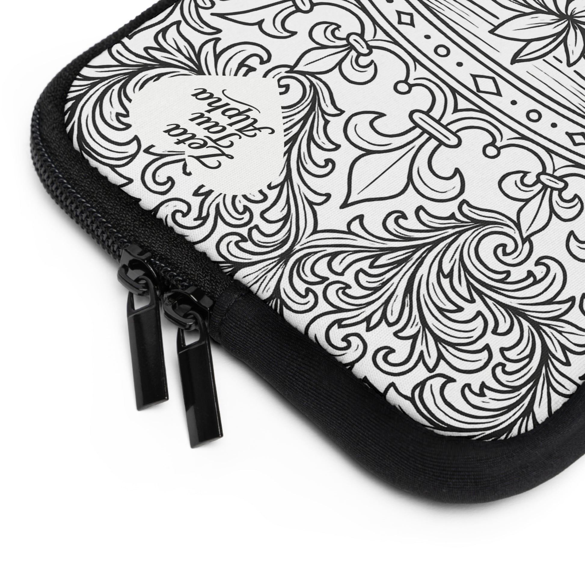 A slim neoprene laptop sleeve that brings calm and personality to daily carry. The front features a hand-drawn, black-and-white floral-and-dove illustration with a small heart monogram area, while the back remains solid black for a clean, low-profile look. Soft foam padding cushions your device against everyday bumps. Dual zippers glide smoothly for quick access, and the water-resistant build keeps spills and light rain from reaching your laptop. Lightweight and available in multiple sizes, this sleeve slips easily into backpacks or tote bags and adds a gentle, artistic touch to study sessions, campus walks, or coffee shop workdays.